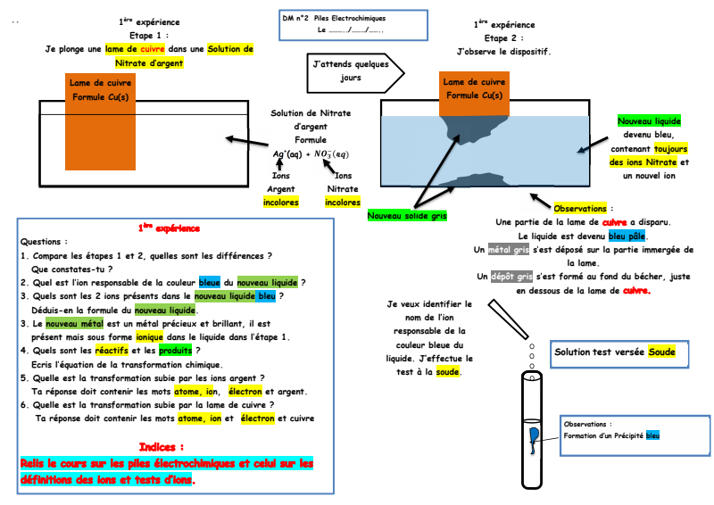 3ème DM n°2 Piles Cuivre -Argent 27 mars 2020, Ce document contient l'énoncé du DM et le cours sur les piles (version allégée AIDE pour faire le DM)Télécharger le document 3ème cours piles Lames Fe et Zn dans CuSO4 23 mars 2020 Live Discord pour avoir des compléments.