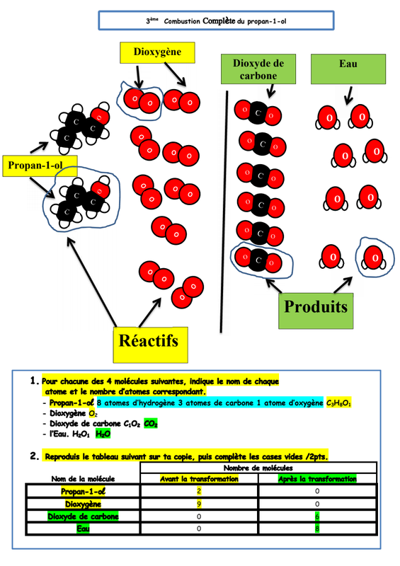 Correction d'un Exercice sur la combustion du propanol Fichier PDF : 3ème correction exercice entrainment combustion propan--1-ol